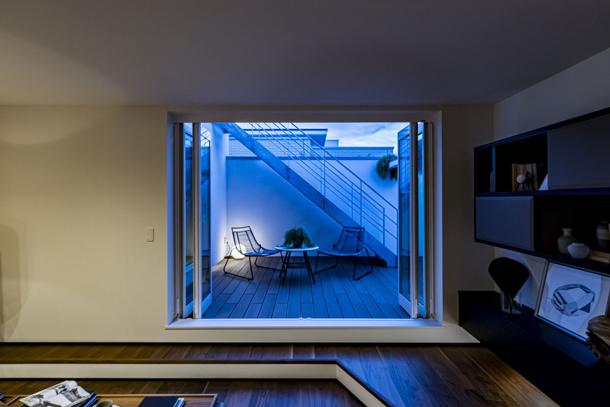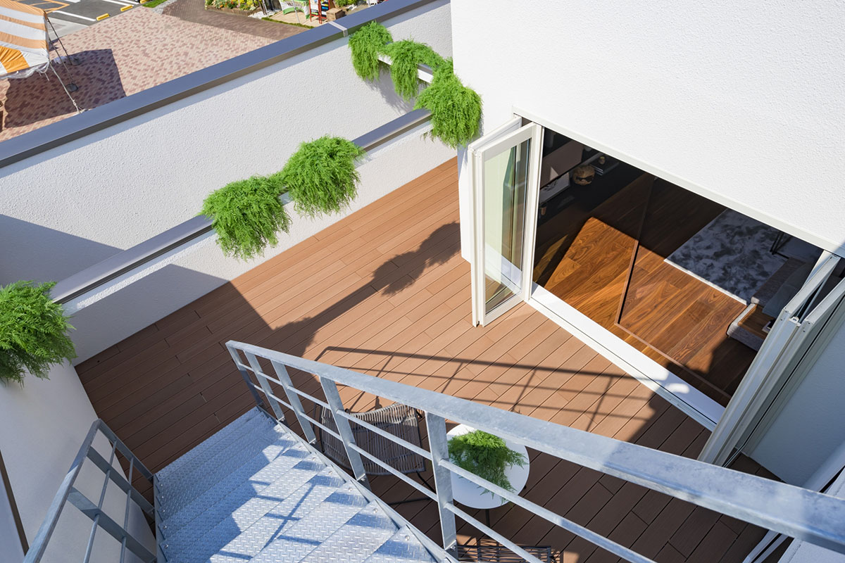 リビング&ダイニングと直結したウッドバルコニー。午後のティータイム。また夜に、カクテルを傾けながらご家族と共に過ごす時間は、それぞれが一生の宝物となるような、かけがえのない思い出になることでしょう。